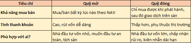 • Có vốn lớn, mục tiêu dài hạn và sẵn sàng chịu thanh khoản thấp → có thể cân nhắc quỹ đóng.