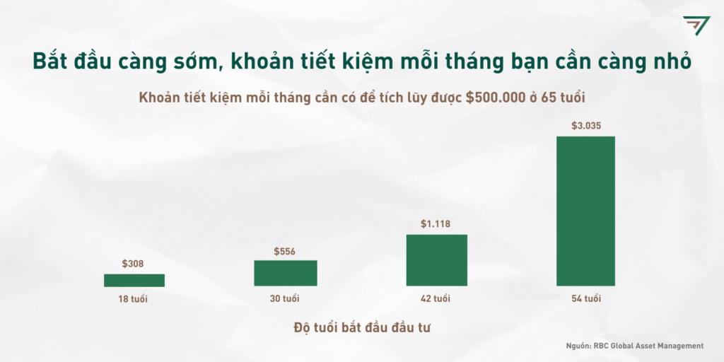 Theo biểu đồ số liệu trên từ Công ty Quản lý Tài sản Quốc tế RBC, với cùng một mục tiêu là tích lũy được $500.000 đô ở 65 tuổi, nhà đầu tư bắt đầu càng muộn sẽ mất gấp càng nhiều lần mỗi tháng so với người bắt đầu sớm hơn, đến hơn một ngàn đô mỗi tháng ở tuổi tứ tuần. Như vậy, ngay cả khi không có nhiều tiền để đầu tư, bắt đầu sớm sẽ giúp bạn cần ít tiền hơn để đạt được kết quả tương tự với người bỏ nhiều tiền hơn nhưng đầu tư trễ.